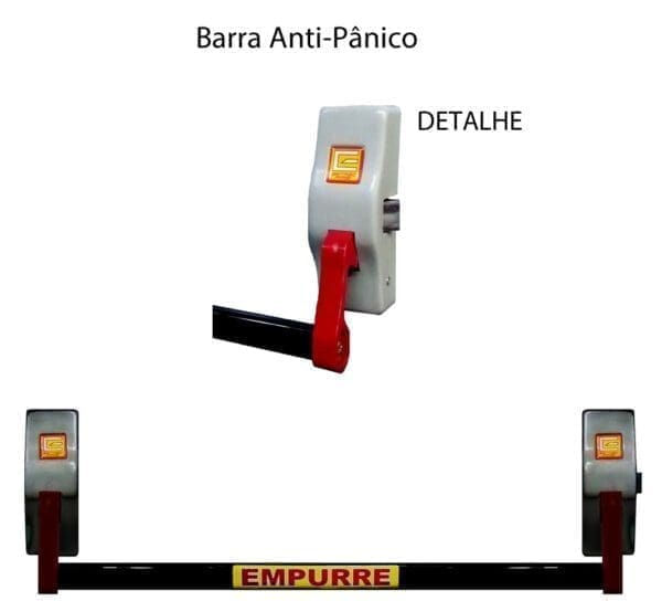 Barra Anti-Pânico uma porta – Dispositivo de destravamento da folha de uma porta, na posição fechada, acionado mediante pressão exercida no sentido de abertura, em uma barra horizontal fixada na face da folha.